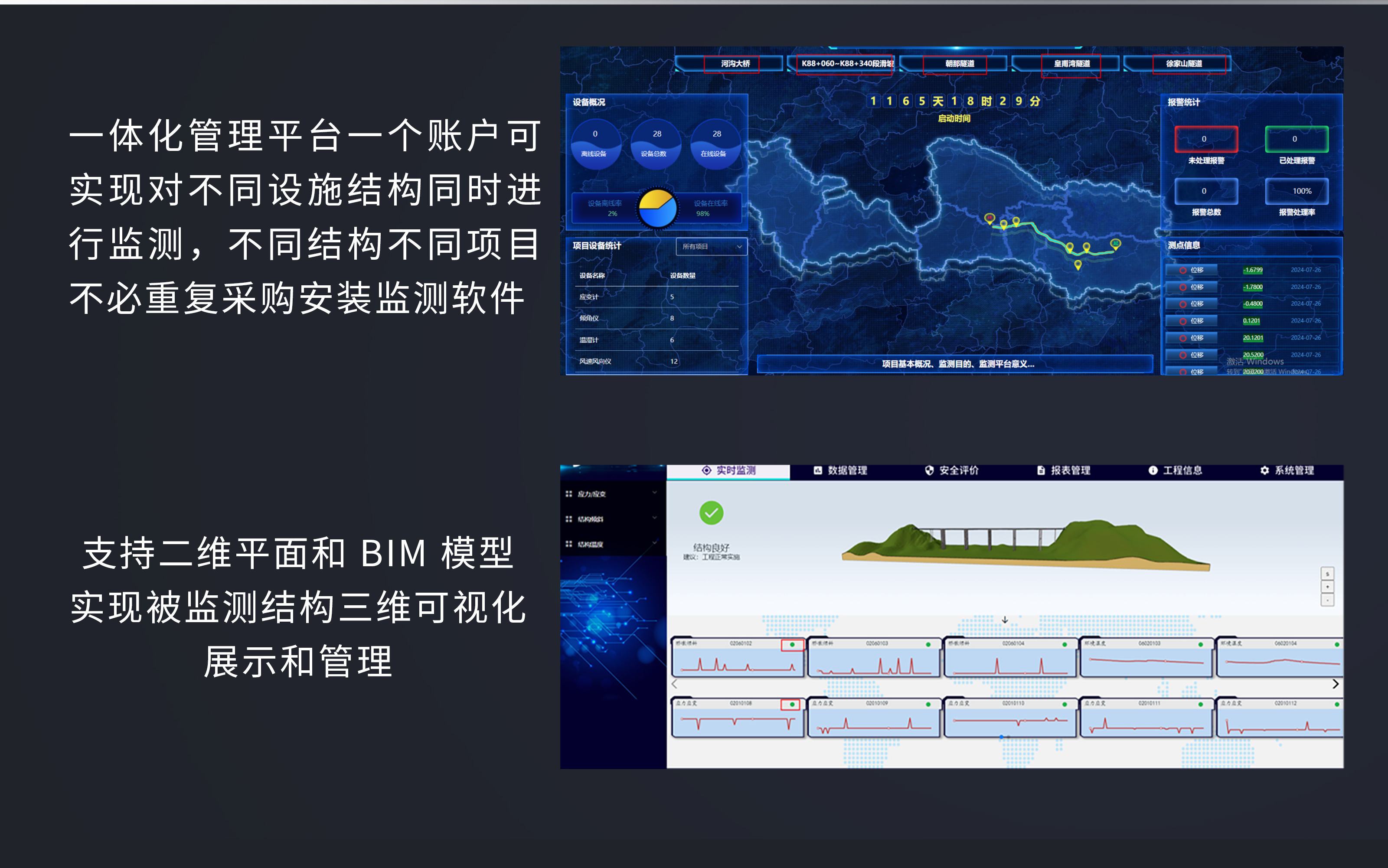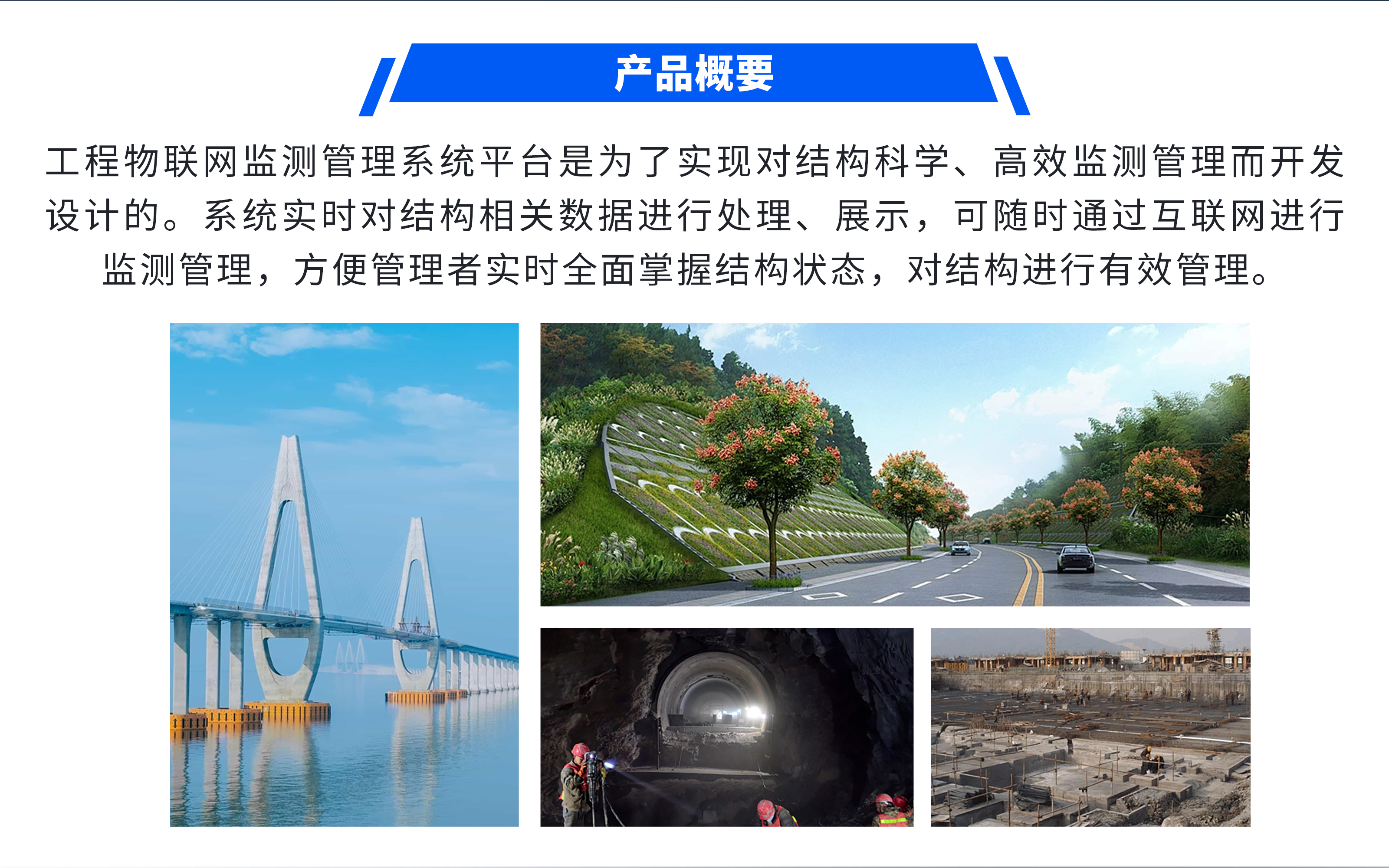 工程物联网监测管理系统平台是为了实现对结构科学、高效监测管理而开发设计的。系统实时对结构相关数据进行处理、展示,可随时通过互联网进行监测管理,方便管理者实时全面掌握结构状态,对结构进行有效管理。