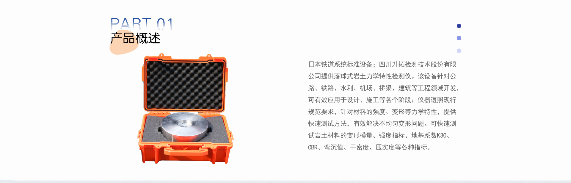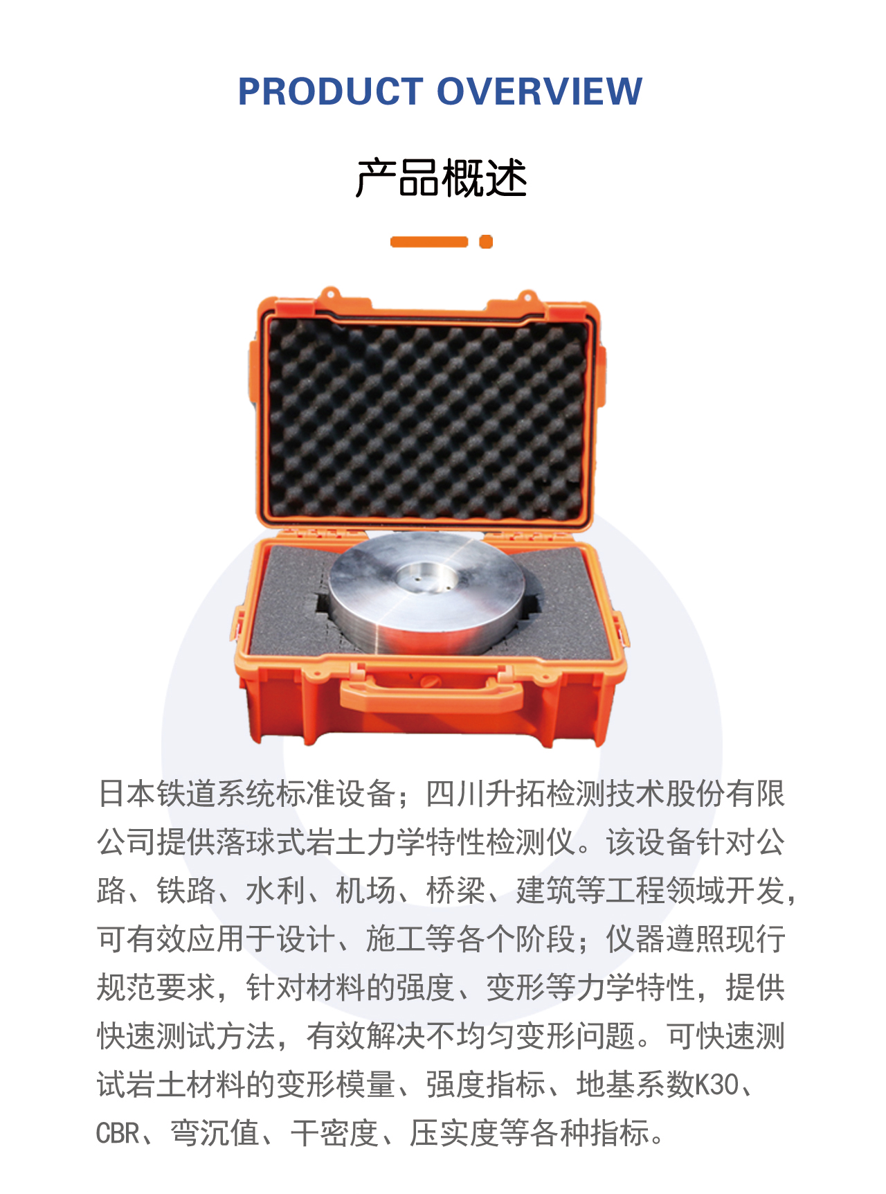 该设备针对公路、铁路、水利、机场、桥梁、建筑等工程领域开发可有效应用于设计、施工等各个阶段;仪器遵照现行规范要求,针对材料的强度、变形等力学特性,提供快速测试方法,有效解决不均匀变形问题。可快速测试岩士材料的变形模量、强度指标、地基系数K30、CBR、弯沉值、干密度、压实度等各种指标。